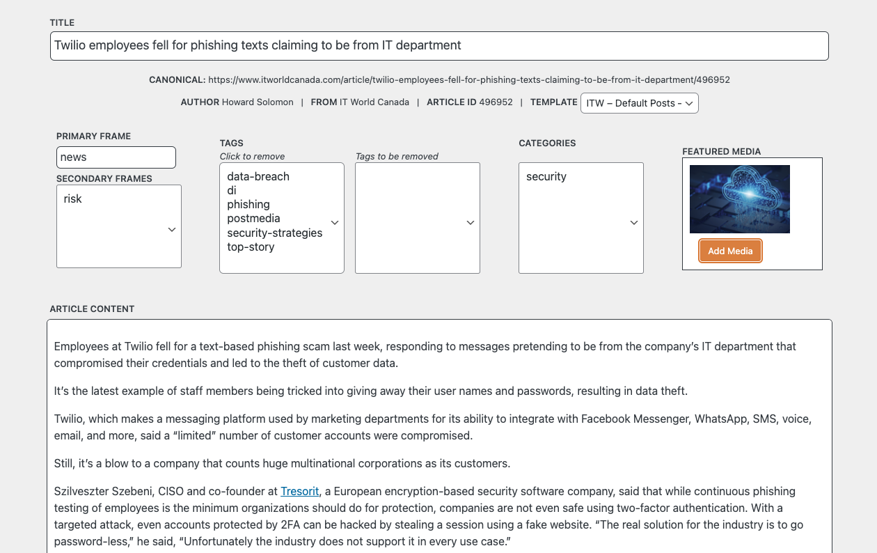 JSON/PHP/Wordpress managed a team project to save editorial time by making the task of copying an article and custom metadata from one site to another as seamless as possible.